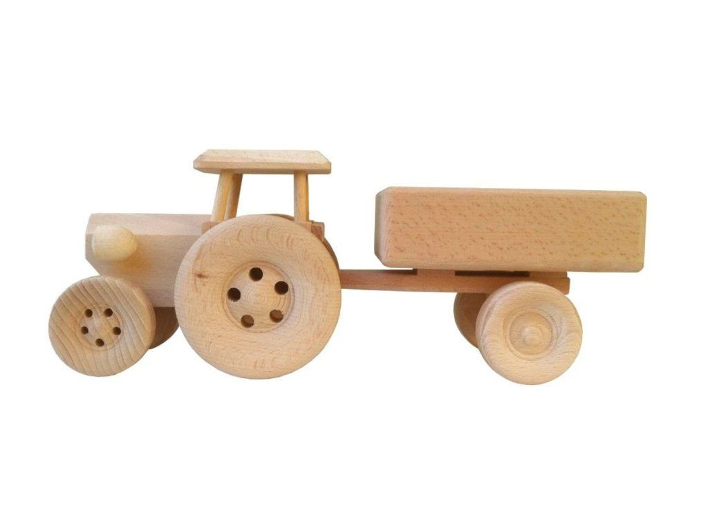 Dřevěný traktor s vlečkou pro malé farmáře. Poctivý dělník, který nesmí chybět na žádné domácí farmě. Tento robustní traktor z masivního dřeva hravě zvládne odvézt úrodu z kuchyně až do obýváku. Odpojitelný přívěs a hladce otočná kola z něj dělají perfektní hračku pro rozvoj dětské motoriky a nekonečné farmářské příběhy.