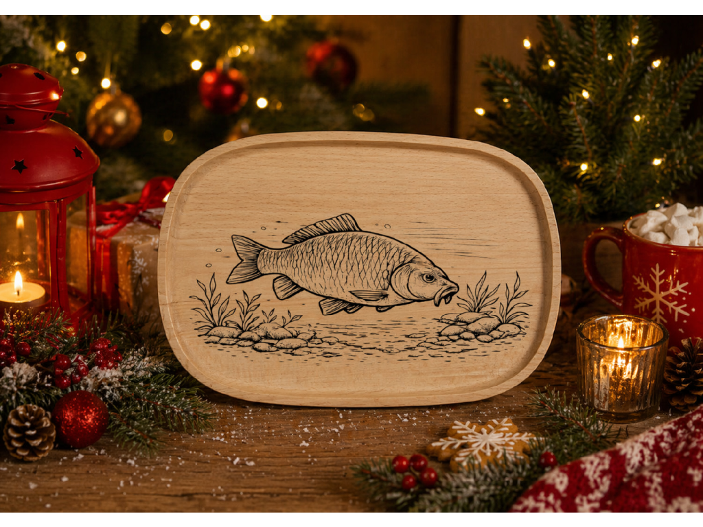 Udělejte si radost doplňkem, který má duši. Náš bukový dřevěný podnos není jen praktickým pomocníkem do kuchyně, ale především skvělý dárek pro milovníky ryb. Díky preciznímu laserovému gravírování přeneseme podobiznu vaší oblíbené ryby přímo do struktury dřeva. Na podnos můžete servírovat ovoce, zeleninu i polední svačinku nebo jej můžete využít, jako dekoraci.