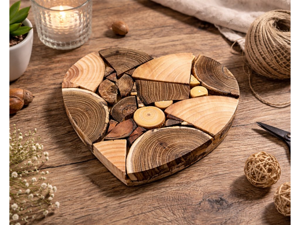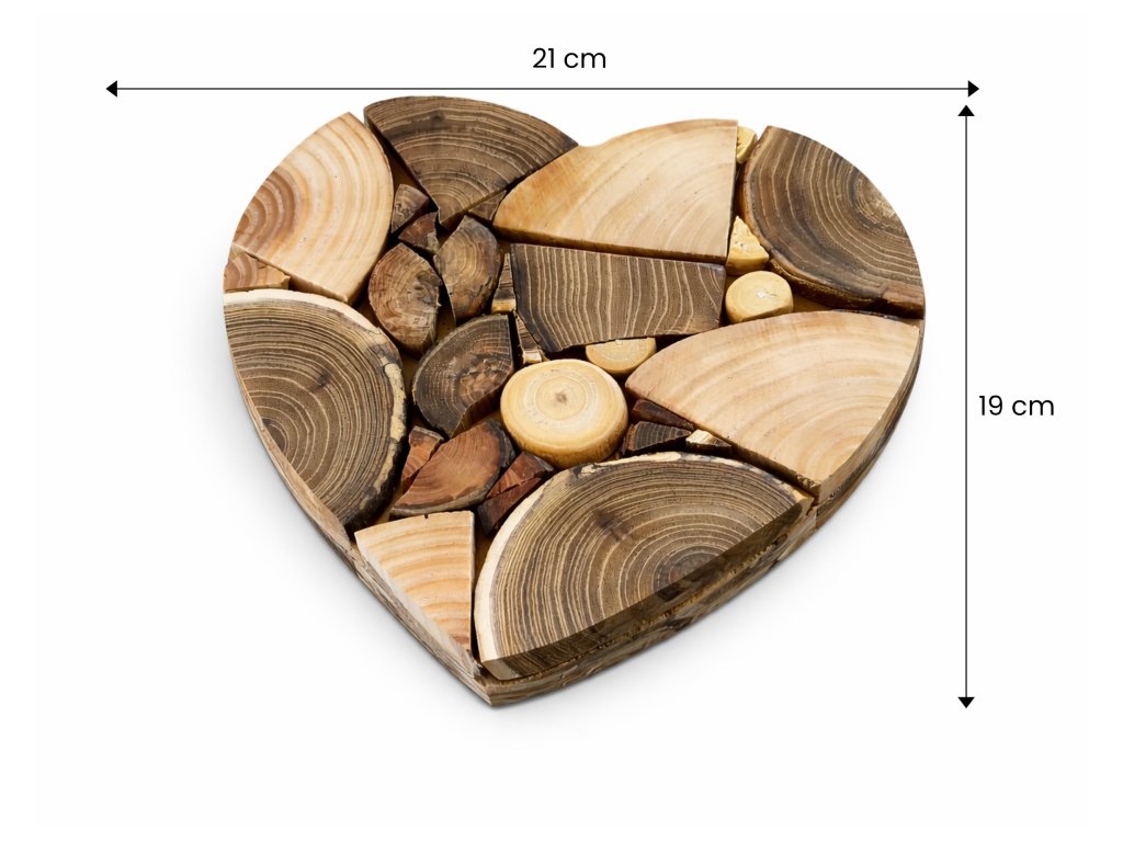Naše podložka Heart Mosaic není jen obyčejný podtác. Je to umělecké dílo vzniklé precizním skládáním výběrových odřezků masivního dřeva. Výsledkem je fascinující mozaika textur, barev a letokruhů, která vdechne život každému stolu. Tvar srdce symbolizuje domov, teplo a ruční práci, kterou do každého kusu vkládáme.