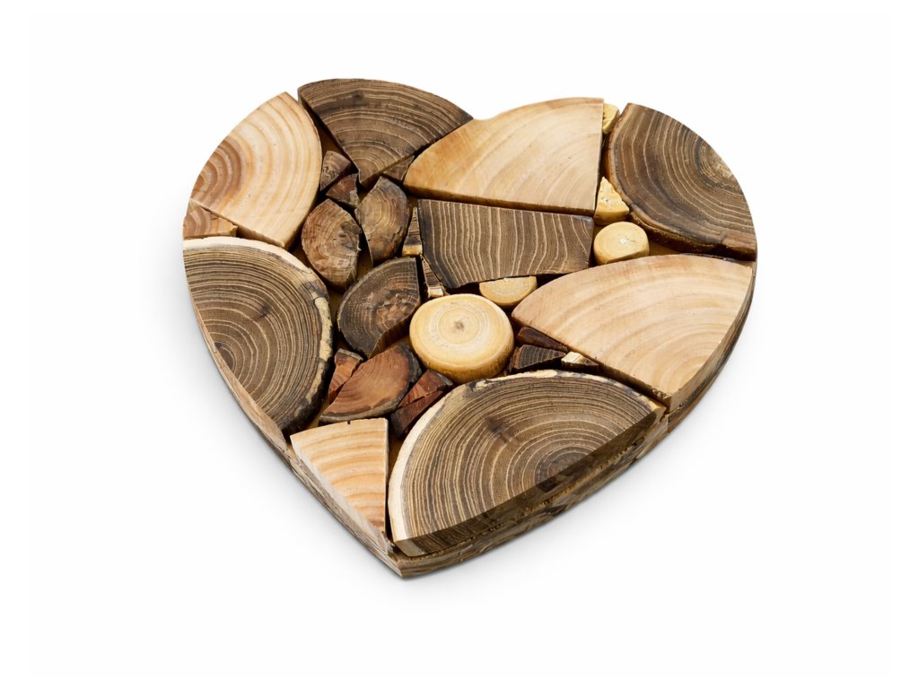 Mozaika přírody: Kombinace různých druhů dřeva vytváří neopakovatelný vizuální efekt. Žádná dvě srdce nejsou stejná.